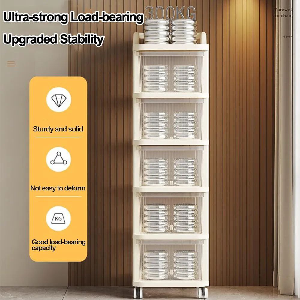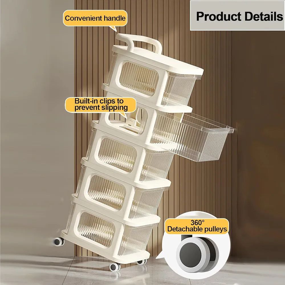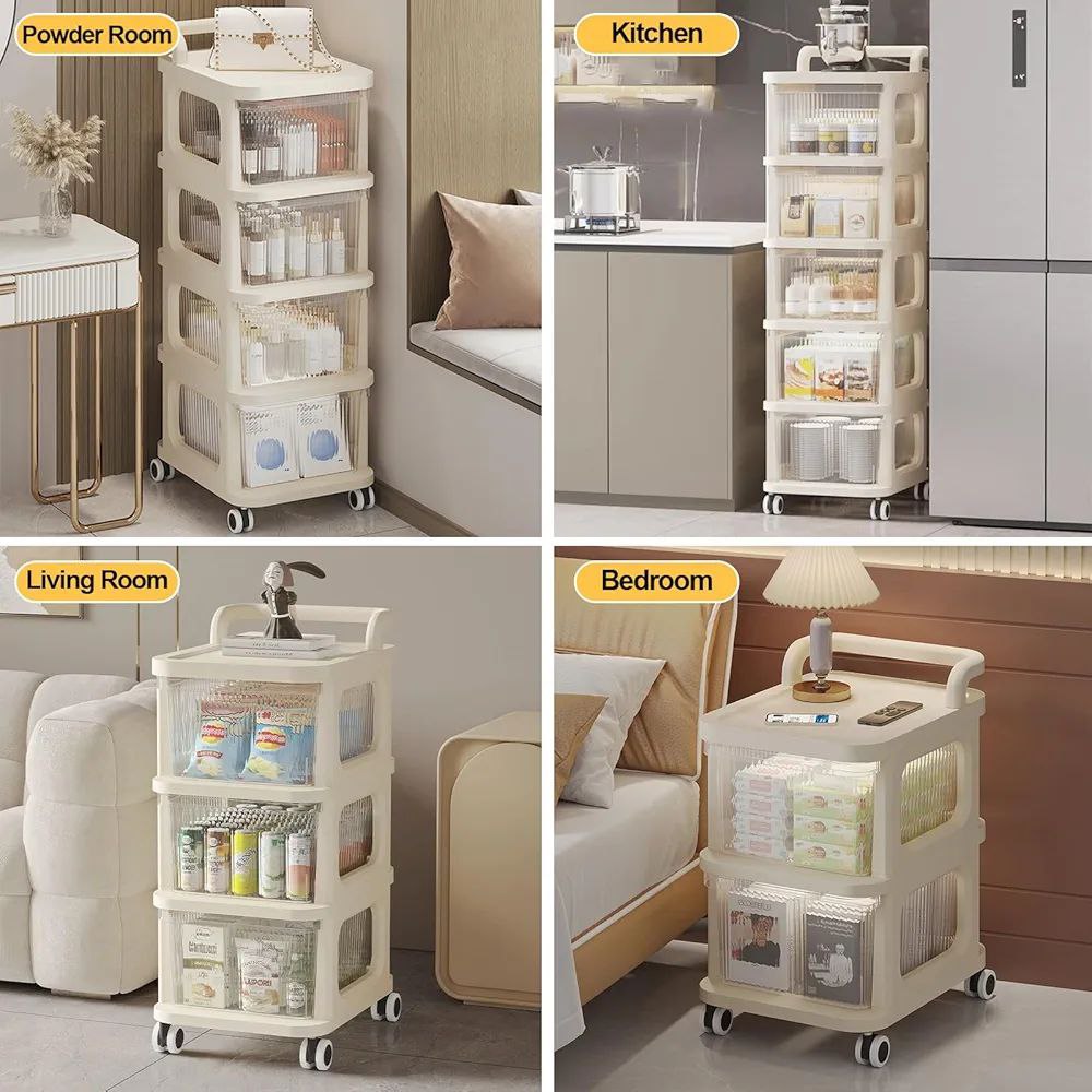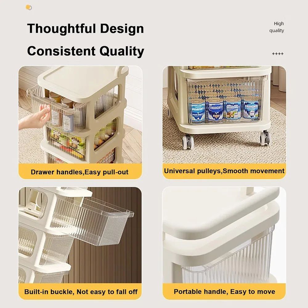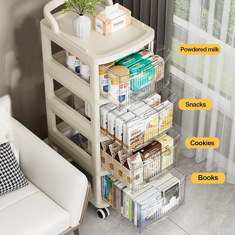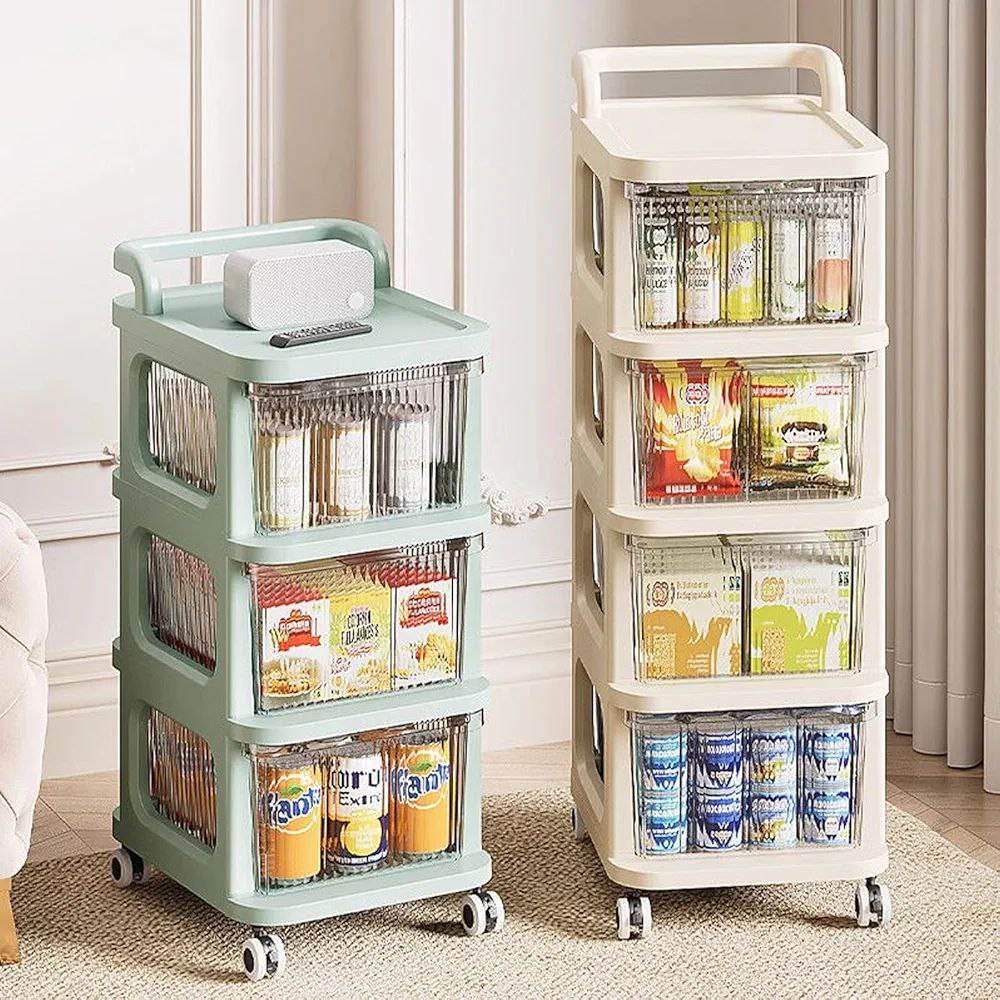 Chariot de rangement à plusieurs niveaux avec tiroirs transparents.